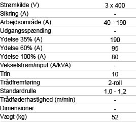Maskinen yder 190A og er således i høj grad velegent til tyndpladesvejsning - feks. i autobranchen.
